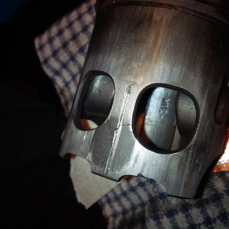 This is a interesting modification. As we all know pistons are taper ground so the largest point of a piston is the skirt measured from front to back of the piston, so to shorten the skirt will can cause the piston to rock in the bore. IMO unless the skirt may come in contact the crankcase or crank wheels I truly can not see why this is done? Also that piston has not seized it looks to me like it has ingested some material through the intake, most pistons pick up on the exhaust side of the bore through heat and lack of lubrication.hybrid wrote:When you get your new pistons, file off that tab!